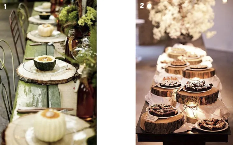 Los troncos nos ayudarán a portar un aire muy mágico y además podemos jugar con distintos diámetros y grosores para crear alturas y composiciones queden juego para combinar con nuestros platos creando mesas especialmente bonitas.