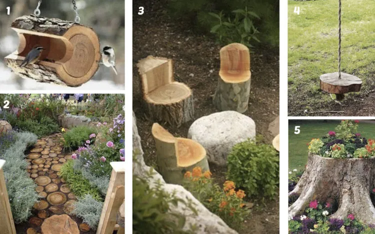 Los troncos nos pueden servir también para dar un aire nuevo a jardines y terrazas. Lo más interesante es que se integra muy bien en el paisaje y quedarán genial con cualquier decoración. Podemos utilizarlos para hacer mesas y bancos, comederos para pájaros, delimitar zonas, crear caminos, realizar originales maceteros incluso mágicos columpios que dan un toque muy especial a los exteriores.
