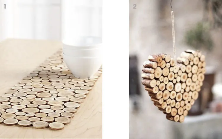 Una de las opciones más prácticas interesantes a nivel visual, es utilizar algunas rodajas chiquititas de tronco para hacer un salva mantel o un camino que adorne nuestra mesa de una forma muy singular. También es muy habitual realizar pequeños adornos utilizando los troncos como por ejemplo este corazón que veis en la imagen que podemos hacer de una forma muy sencilla y que nos puede servir para adornar alguna puerta o simplemente para colgarlo en algún lugar de nuestra casa.