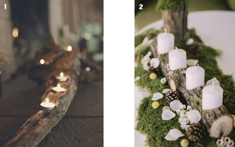 Otra posibilidad es usar estos troncos a modo de portavelas y podemos extenderlos en el centro de la mesa de forma horizontal o bien utilizados como base para que la cera no termine la superficie de la mesa. Podemos jugar con nuestra imaginación para crear diseños de lo más sorprendentes y originales utilizando troncos y velitas que siempre es una combinación muy mágica.