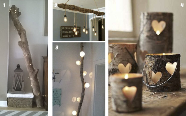 Se pueden utilizar los troncos a modo de soporte para colgar de ahí distintas lámparas o apoyarlos en un rincón y enrollar una guirnalda luminosa para lograr un espacio muy especial.